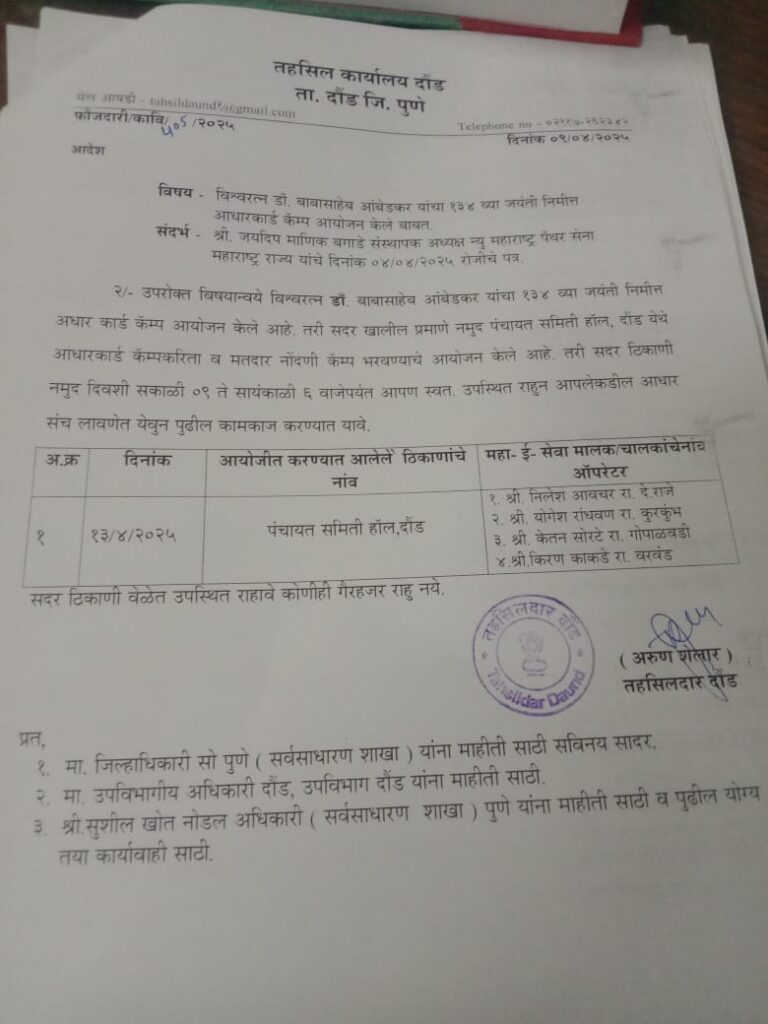 हे सर्व संपुर्ण महाराष्ट्र राज्यभर आंदोलन उभे राहिले आणि काही अनुचित प्रकार घडल्यास सर्वस्वी दौंड तहसिल कार्यालय जबाबदार राहिल हे खुले पत्र लोक शाहीला गृत धरून साधर करत आहे. तसेच उदया आपल्या कार्यालयास रजिस्टर पोस्टाने व २००० ITअॅट नुसार ईमेल द्वारे पाठवणार आहे. हयाची दखल घ्यावी.जर दौंड तहसिलदार साहेब अरूण शेलार यांनचा आदेश मानत नसतील तर ते भारतातील कायदा मानत नाही. हे देखील मान्य करून इतर कलमा नुसार फौजदारी गुन्हे दाखल करण्यात यावे.आणि आज पासून यांन च्या आयडी वरून आधार कार्ड व दुरूस्ती करण्यात आली तर संपूर्ण जबाबदारी ही दौंड तहसिलदार कार्यालयाची राहिल यांची नोंद घ्यावी.
